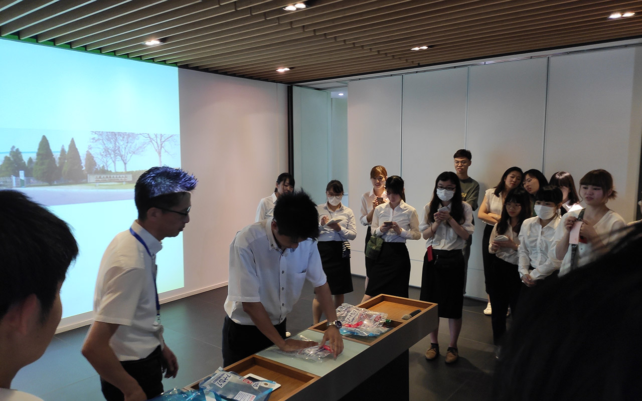 下午,學生們在天津外國語大學領隊的帶領下抵達工廠,吉川副總首先對工廠的整體概況做以簡單介紹,隨后開始工廠參觀。在輸液展覽室,吉川副總分別對輸液的發展歷史、公司產品做了詳細講解,大家親自體驗易撕膜和塑料安瓿的開啟方法,便捷且安全的操作方式讓學生們體會到醫藥行業的發展與進步。在“未來輸液區”,吉川副總著重介紹了多腔袋產品,為學生們詳細講解各小室的成分、原理和使用方法,并利用樣品進行親自示范,學生們十分好奇,體驗后紛紛驚嘆于技術進步為人類生活帶來的更多便利。