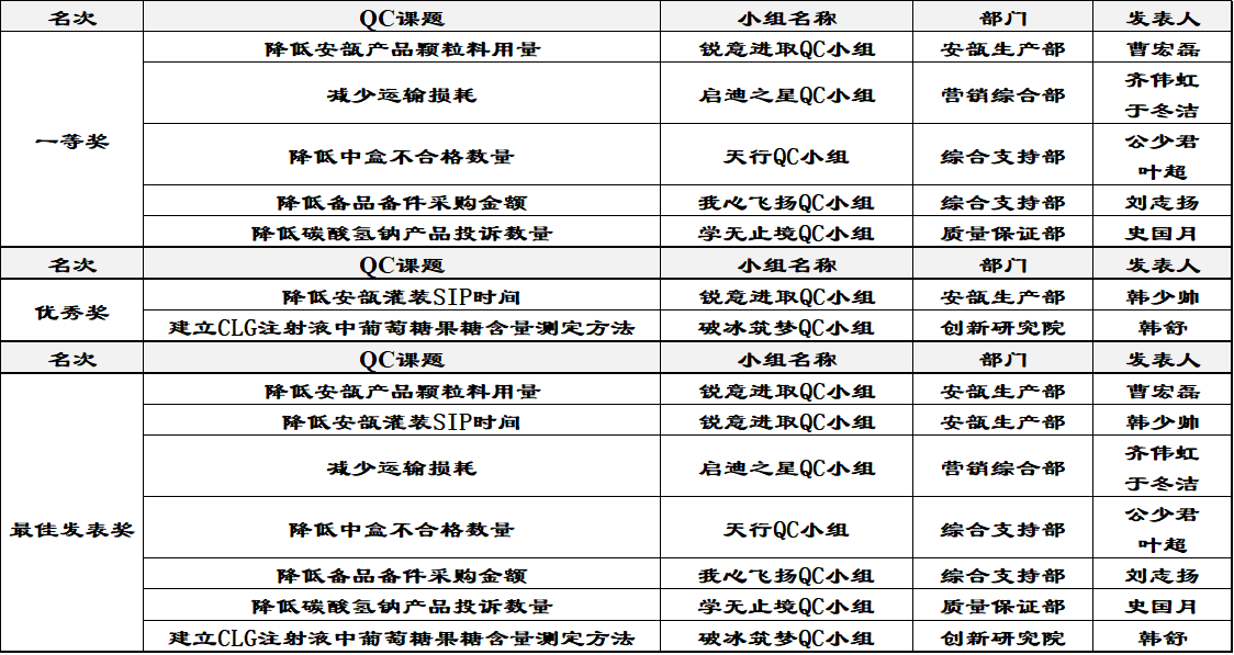 今年QC小組活動(dòng)在公司各部門的大力支持和共同參與下共推選出7個(gè)課題參與此次市級(jí)交流活動(dòng),并取得了5個(gè)一等獎(jiǎng)、2個(gè)二等獎(jiǎng)、7個(gè)最佳發(fā)表獎(jiǎng)的良好成績。同時(shí),公司連續(xù)三年獲得了天津市醫(yī)藥行業(yè)優(yōu)秀QC小組活動(dòng)成果——優(yōu)秀組織獎(jiǎng)。